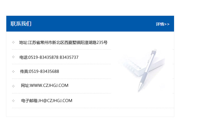地址:常州市新北區友邦商務大廈1幢16、17層  電話:0519-85101652  傳真:0519-85112595  郵編:213022  網址:www_cz-jiayue_cn.guoweianbao.com  郵箱:xiajifengaa@163.com